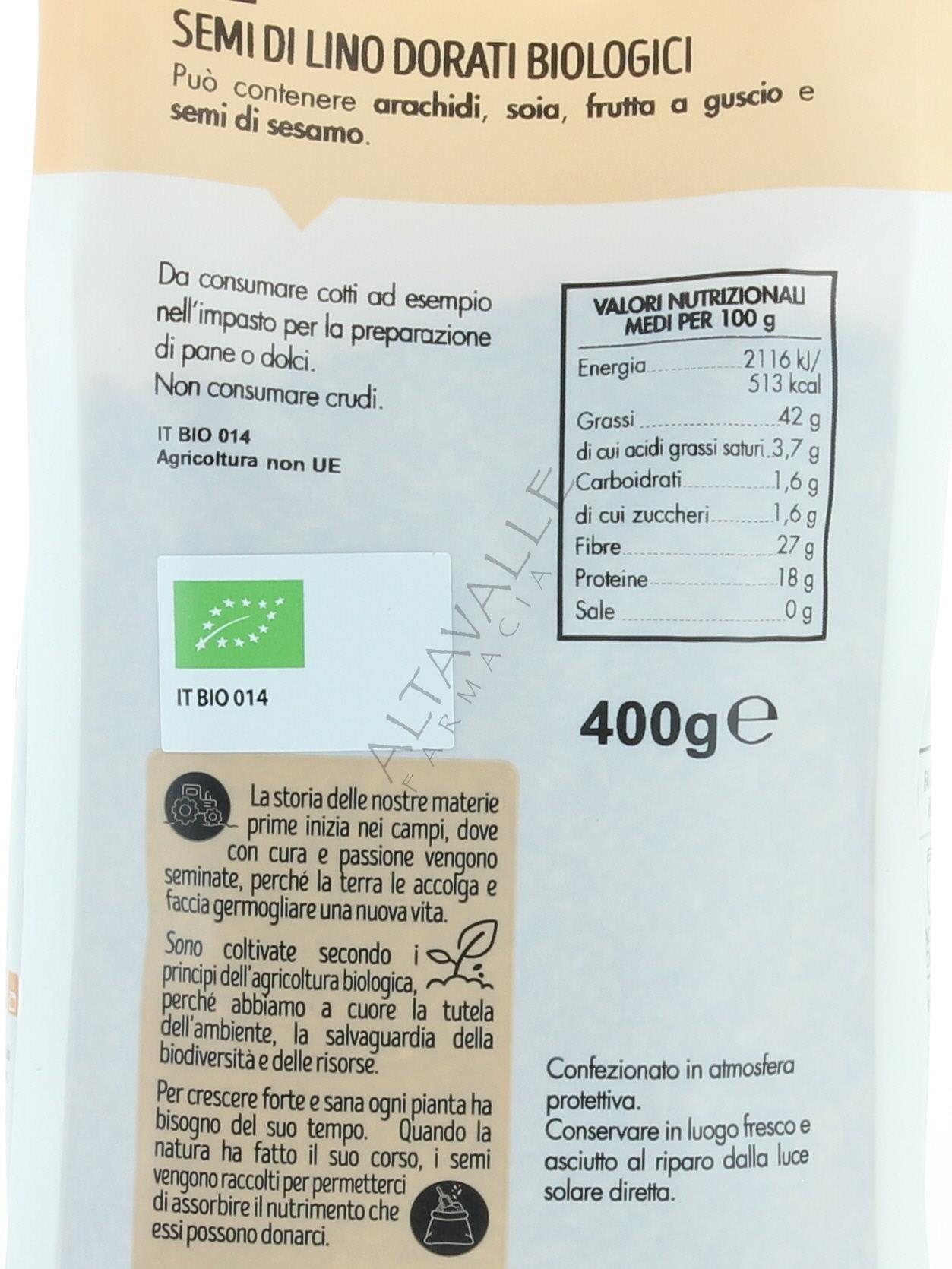 Fior di Loto Lino Semi Dorati biologici fonte di: fibre 29%, proteine 21,2%, grassi 31%, carboidrati 12%