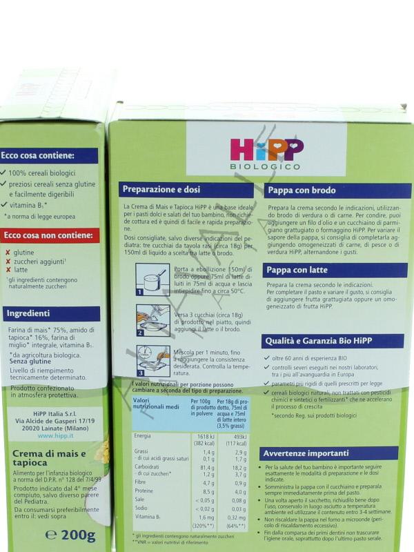 Hipp Bio Crema Cereali Mais Tapioca crema istantanea di farina di mais, l’amido della tapioca,