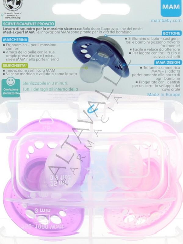 Mam Succhietto Silicone 16+ Night si illumina al buio, è ortodontico con ampi fori di ventilazione,