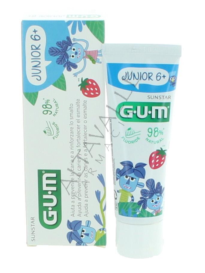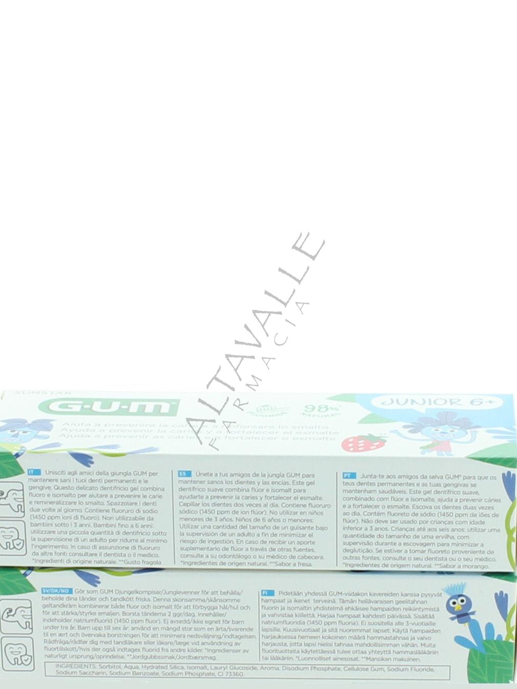 Gum Dentifricio Junior 7-12 anni al gusto fragola con consistenza in gel con glitters è sviluppato per le specifiche esigenze dei denti permanenti,