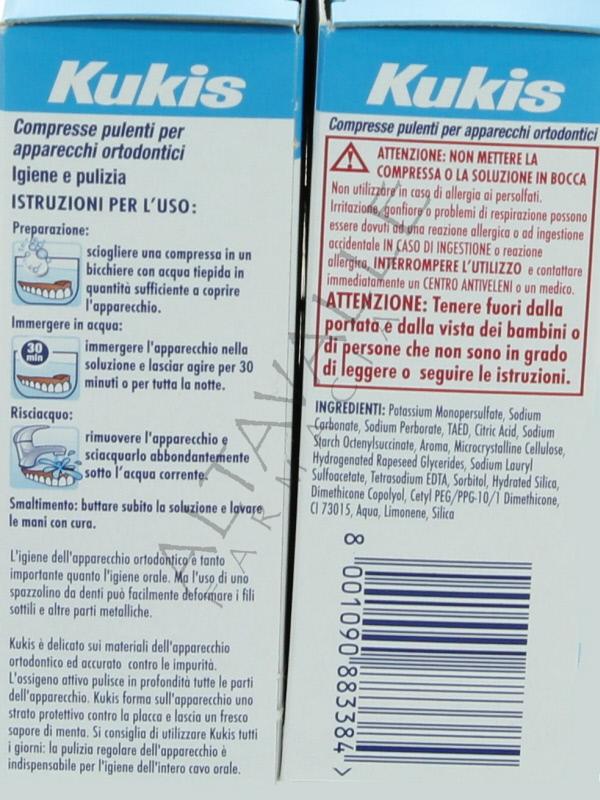 Kukis Compresse è un trattamento auto-attivo studiato per detergere delicatamente le strutture dell'apparecchio ortodontico;