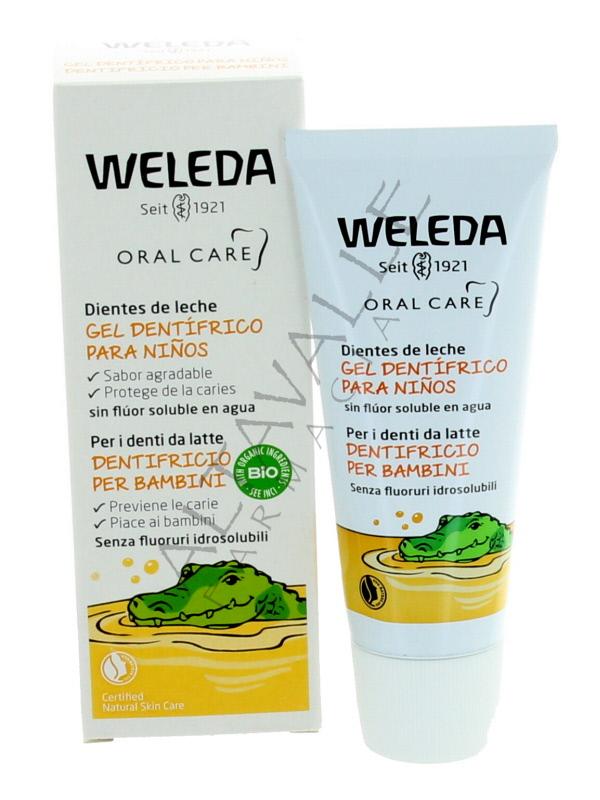 Weleda Baby gel dentifricio per bambini, pulisce a fondo senza contenere sostanze che potrebbero danneggiare nel caso in cui venisse ingerito; unita ad una pulizia regolare, aiuta ad eliminare la placca e previene la formazione di carie;