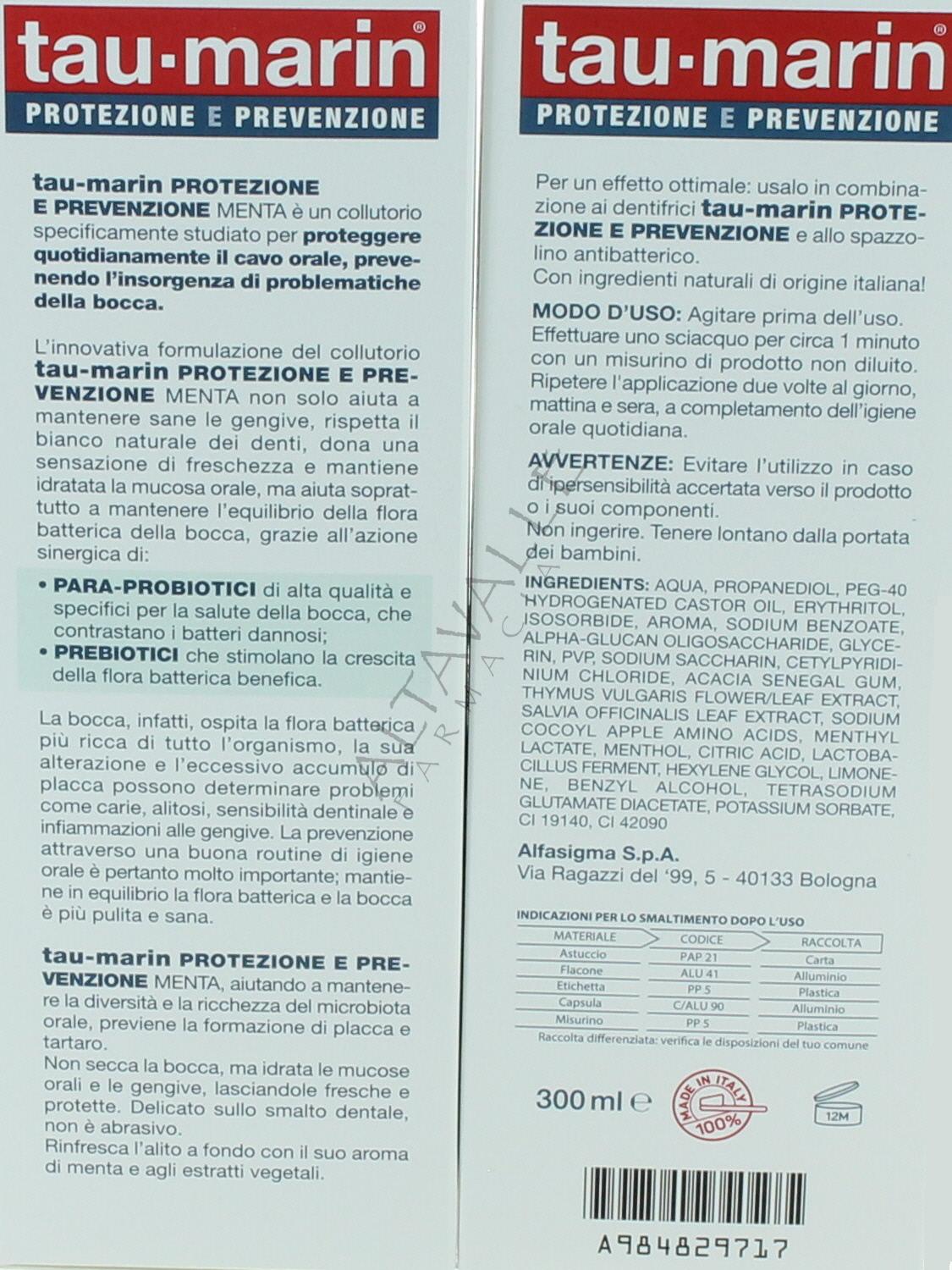 Taumarin Colluttorio Protezione e Prevenzione con prebiotici e para-probiotici per l’equilibrio del microbiota orale;