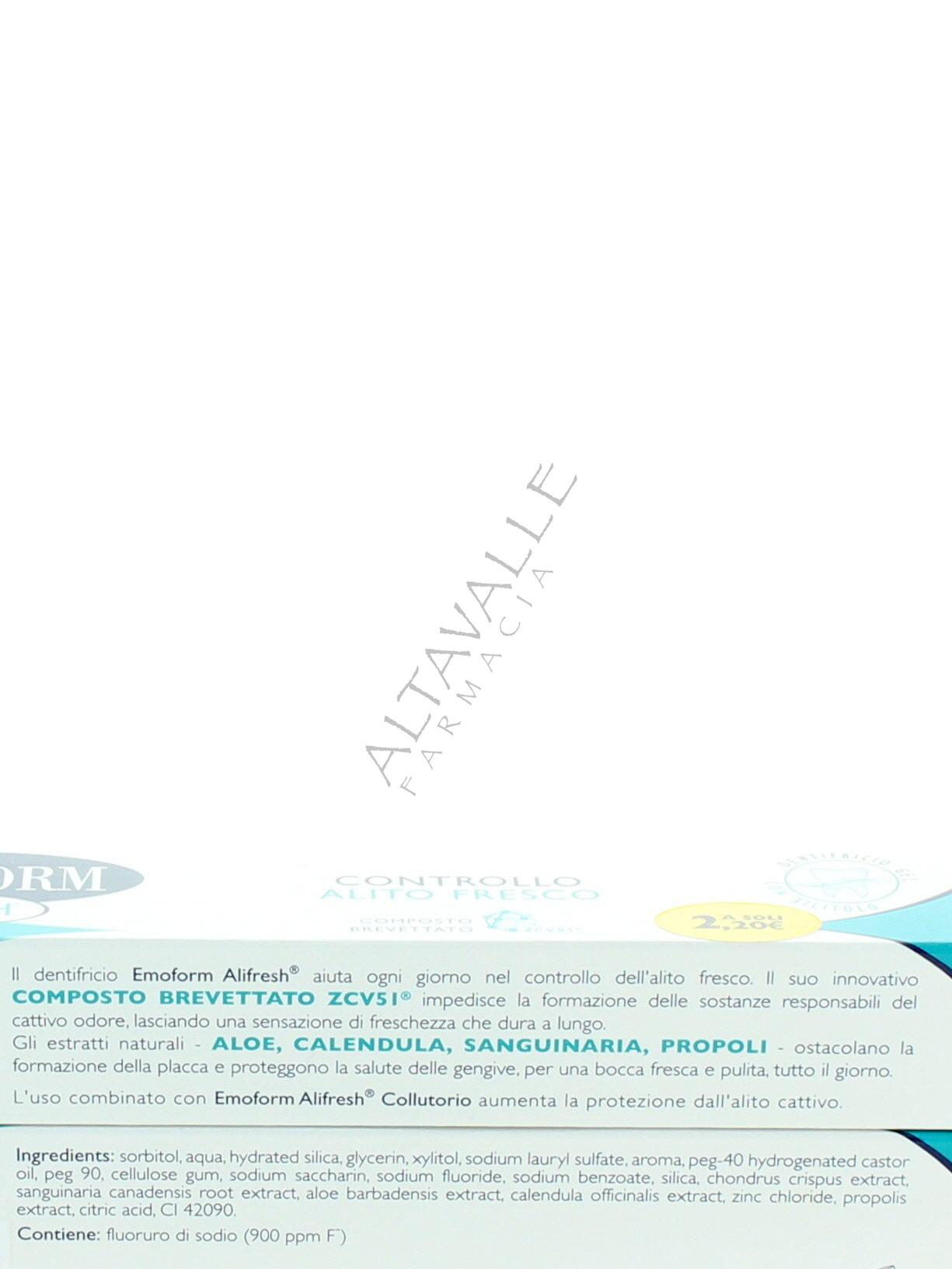 Emoform Alifresh Dentifricio con l’utilizzo regolare rappresenta un aiuto nel controllo dell’alitosi; il cuore del prodotto è l’innovativo composto brevettato zcv51®, che favorisce la riduzione dei livelli delle sostanze responsabili dell’alitosi;