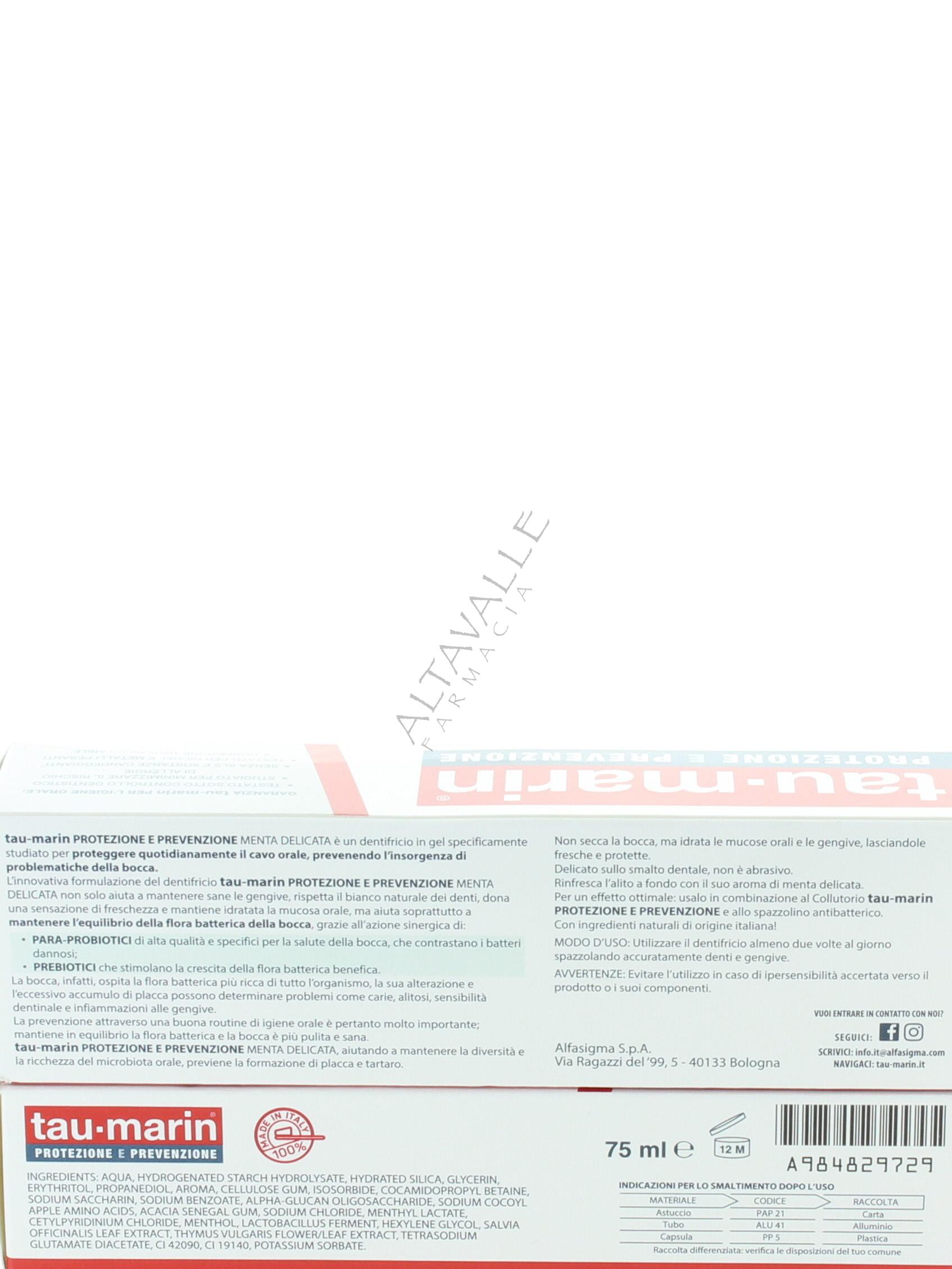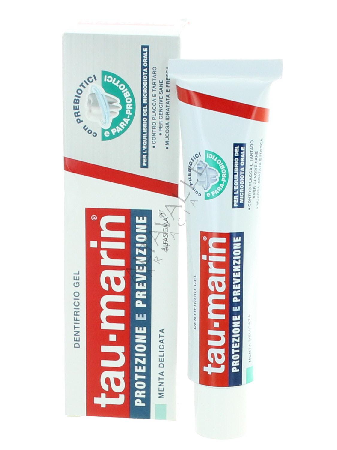 Taumarin Dentifricio Gel gusto menta delicata protezione e prevenzione con prebiotici e para-probiotici per l'equilibrio del microbiota orale;