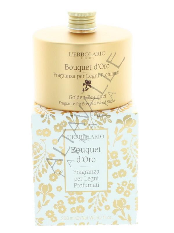 L'Erbolario Bouquet d'Oro Fragranza per Legni profumati con 7 bastoncini in rattan in un raffinato flacone color oro per profumare piacevolmente l’ambiente in cui si soggiorna;