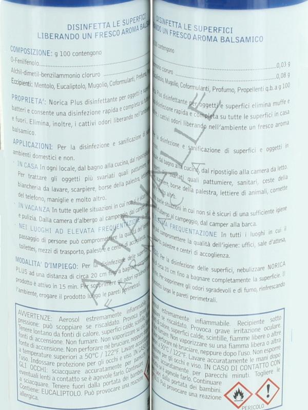 Norica Plus Spray disinfetta le superfici liberando un fresco aroma balsamico,