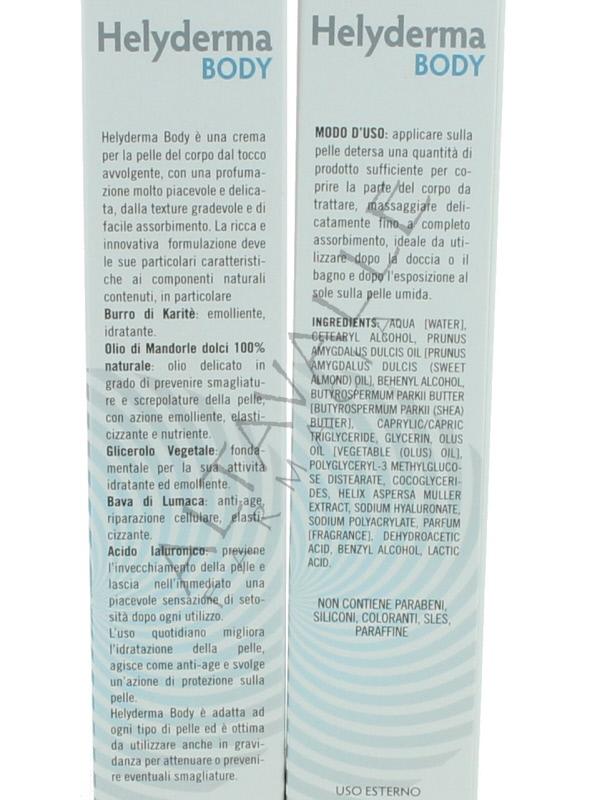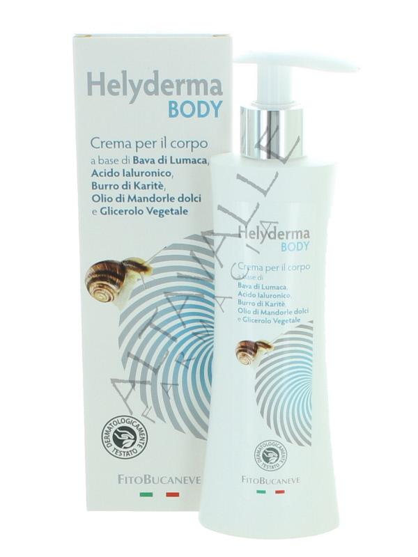 Helyderma Body Crema con bava di lumaca per la pelle del corpo dal tocco avvolgente, per tutti i tipi di pelle, profumazione molto piacevole e delicata, texture gradevole, facile assorbimento, ottima in gravidanza per attenuare o prevenire smagliature, l'uso quotidiano migliora l'idratazione della pelle, agisce come anti-age e svolge un'azione di protezione sulla pelle;
