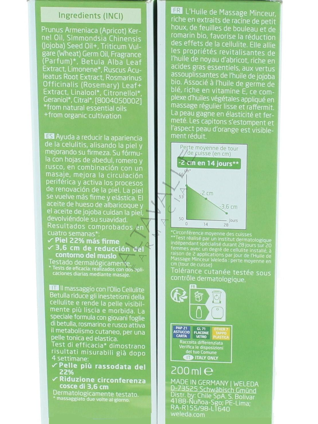 Weleda Olio Anticellulite alla Betulla contiene pregiati estratti oleosi di piante officinali: rosmarino, rusco e giovani foglie di betulla selezionate accuratamente e raccolte a mano;