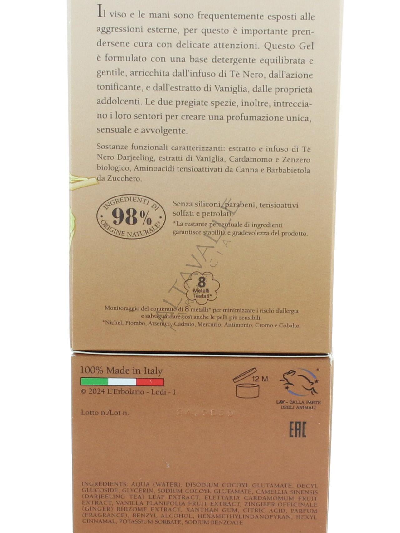 L'Erbolario Tè Nero Gel Detergente Viso & Mani con infuso di Tè Nero Darjeeling ed estratto di Vaniglia;