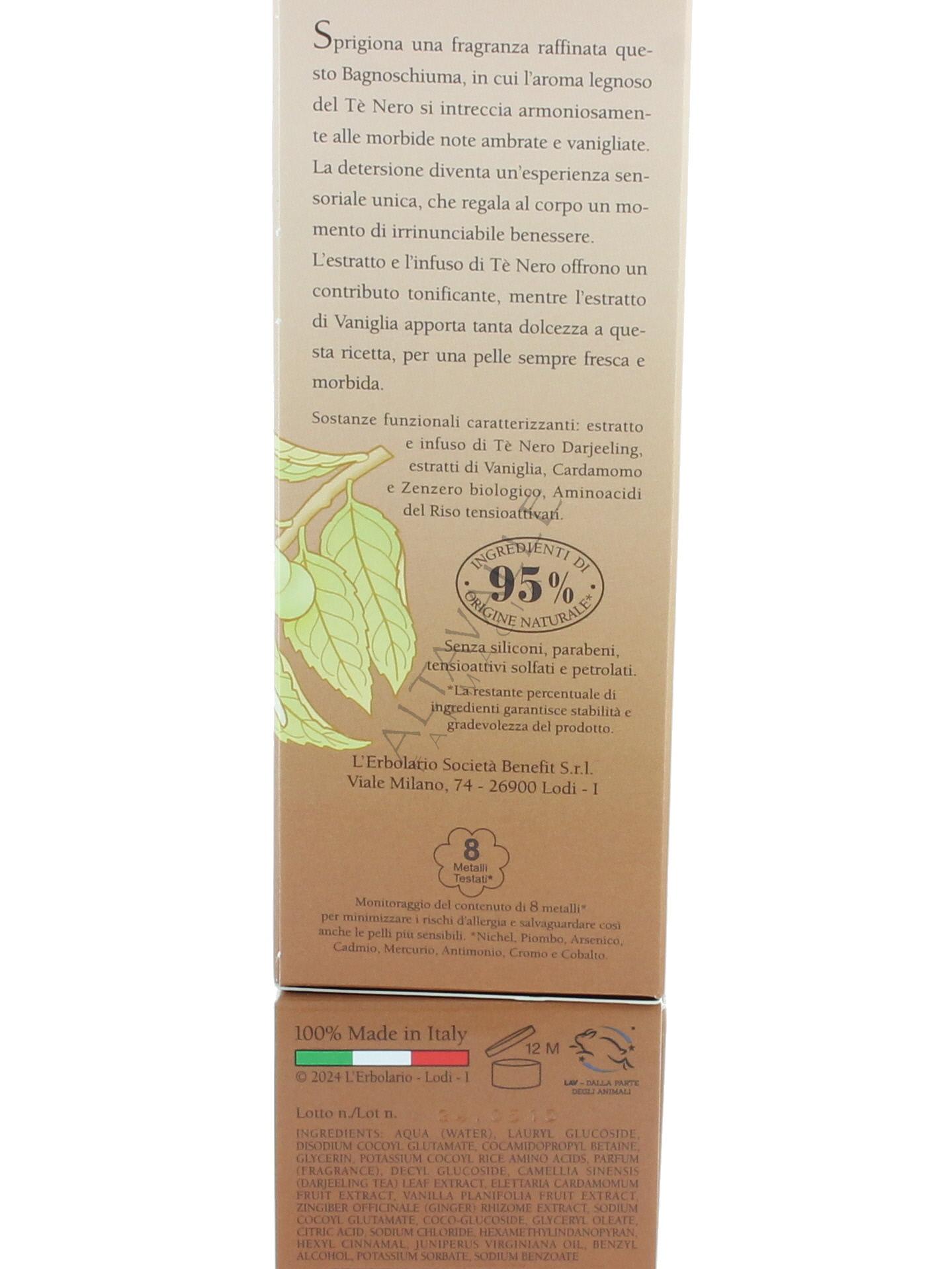 L'Erbolario Tè Nero Bagnoschiuma con infuso di Tè Nero Darjeeling ed estratto di Vaniglia;