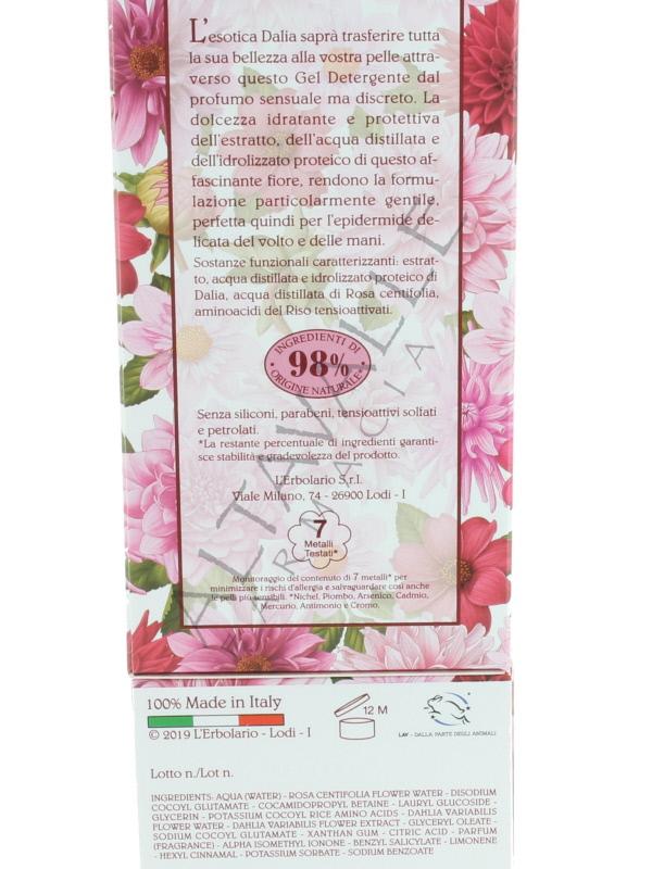 L'Erboilario Sfumature di Dalia Gel Detergente Viso e Mani profumo sensuale e discreto, deterge, idrata e protegge la pelle, grazie a l’estratto, l’acqua distillata e l’idrolizzato proteico di dalia;