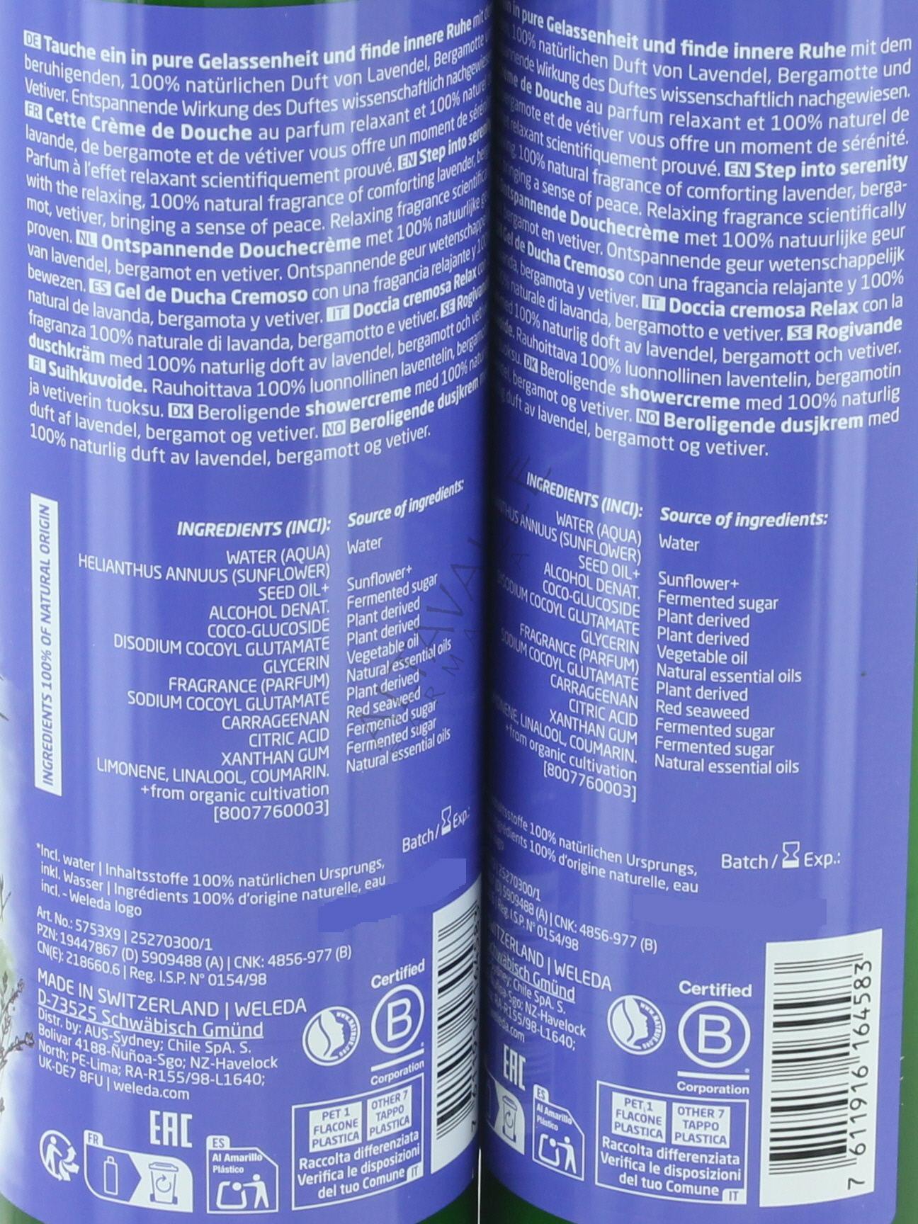 Weleda Relax Doccia Cremosa con note di lavanda, bergamotto e vetiver;