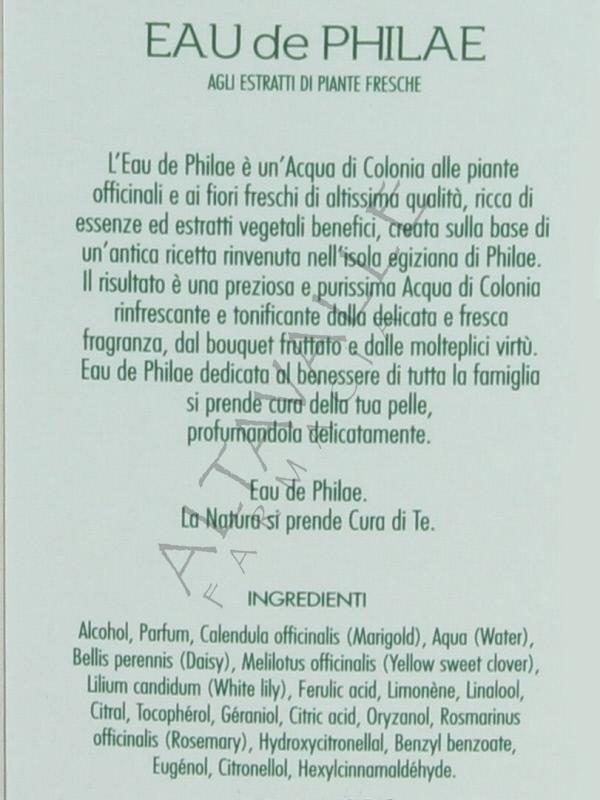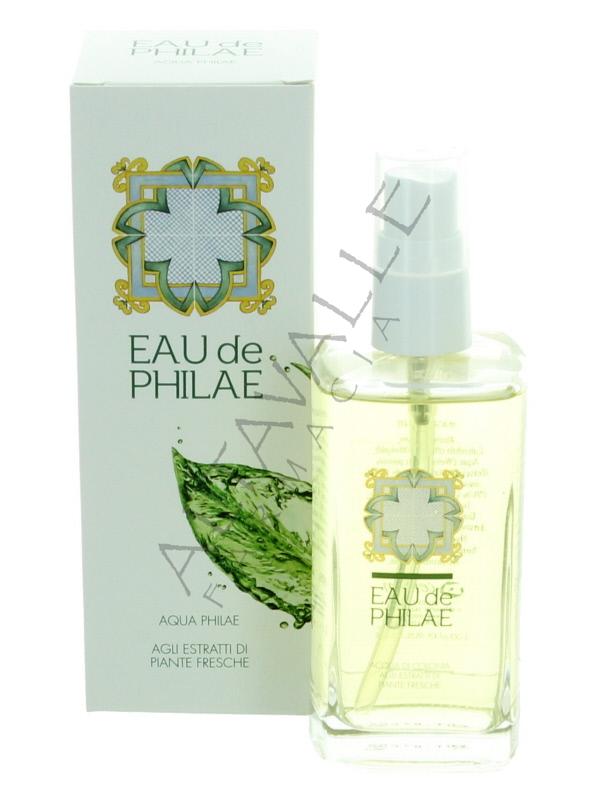 Eau de Philae è una purissima acqua di colonia alle piante officinali, ai fiori freschi e oli essenziali, una soluzione alcolica profumata, dal bouquet fruttato, ricco di fragranza, rinfrescante e tonificante, dalle molteplici virtù benefiche;