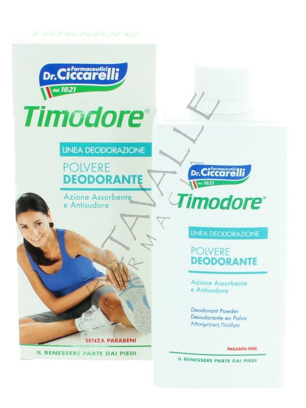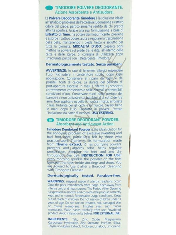 Timodore Polvere deodorante utile in caso di eccessiva sudorazione, macerazione e cattivo odore del piede;