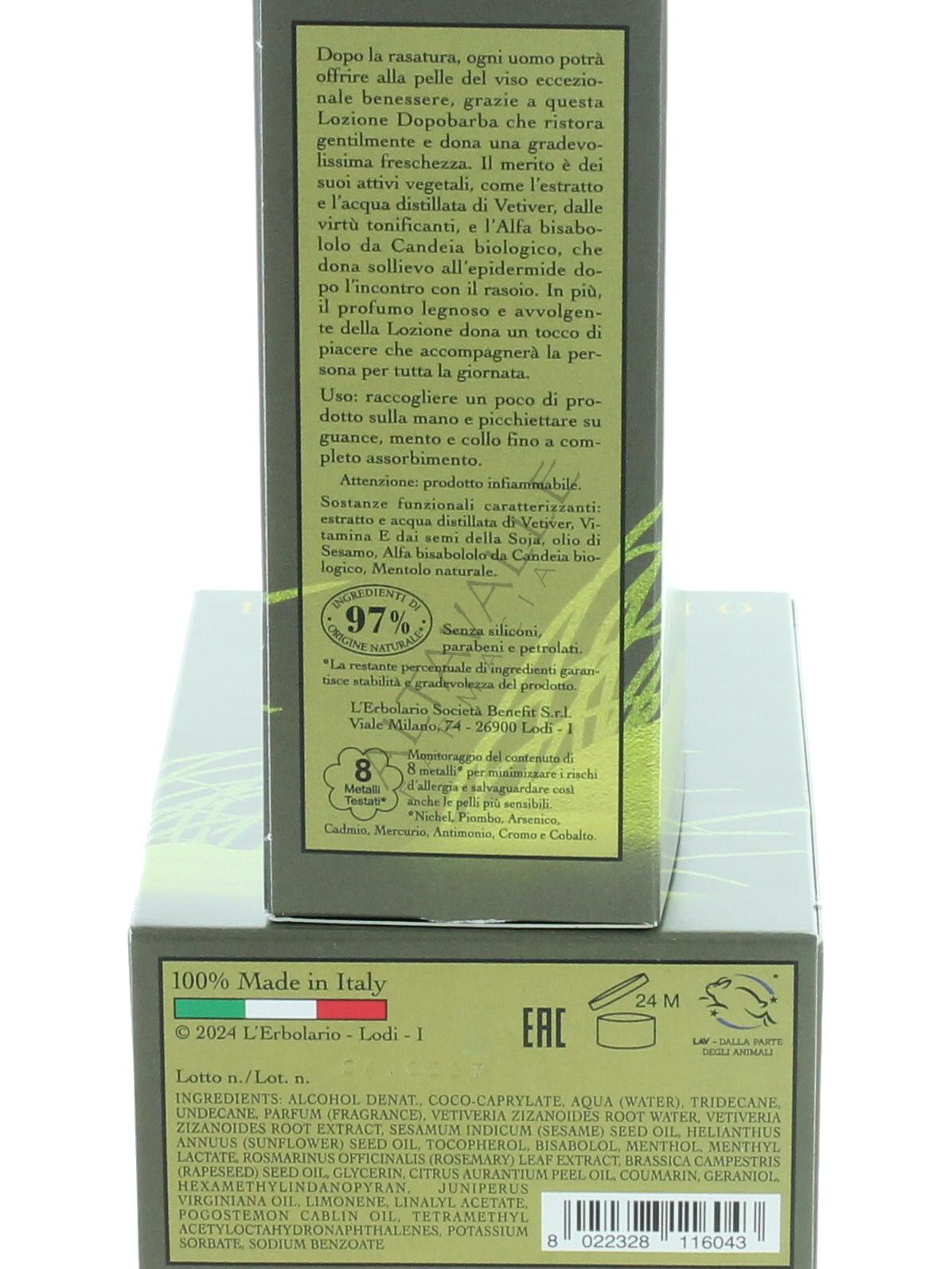 L'Erbolario Vetiver Lozione Dopobarba con estratto e acqua distillata di Vetiver;