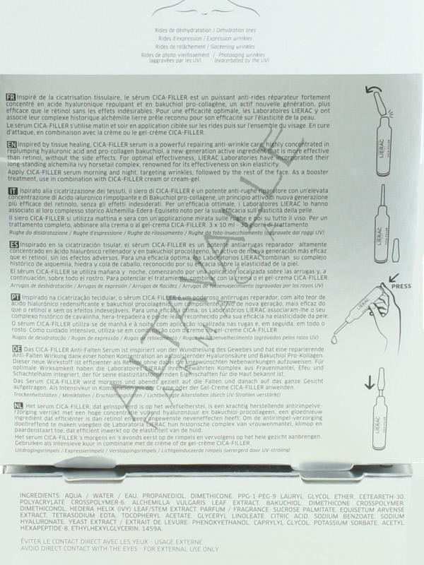 Lierac Cica Filler Siero è un trattamento urto antirughe, grazie all'applicazione in fiale agisce nel cuore della ruga e consente un'applicazione igienica, pratica e precisa;