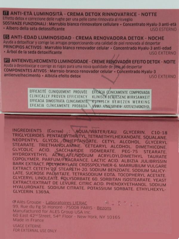 Lierac Supra Radiance Crema Notte Anti-Ox Rinnovatrice per tutti i tipi di pelle è ispirata alla medicina nutrizionale e ambientale, questa crema associa l'estratto di marrubio bianco, che combatte l'invecchiamento dermo-tossinico, al concentrato Hyalu-3 anti-età, la sua formula è inoltre arricchita con estratto di albero della seta detossificante, acido lattico e glicolico leviganti;