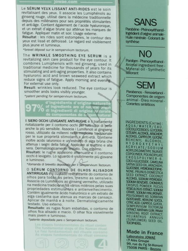 Jowae Siero Occhi Levigante Antirughe ai Lumifenoli antiossidanti e Ginseng Rosso: leviga, distende e tonifica, lo sguardo è visibilmente più giovane, più luminoso;