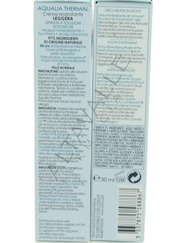 Vichy Aqualia Thermal Leggera ispirata a soluzioni isotoniche con acqua mineralizzante, zucchero, acido ialuronico,