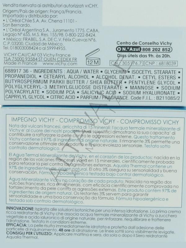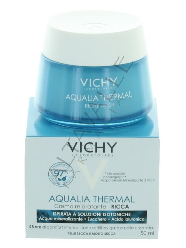 Vichy Aqualia Thermal Ricca ispirata a soluzioni isotoniche con acqua mineralizzante, zucchero, acido ialuronico,