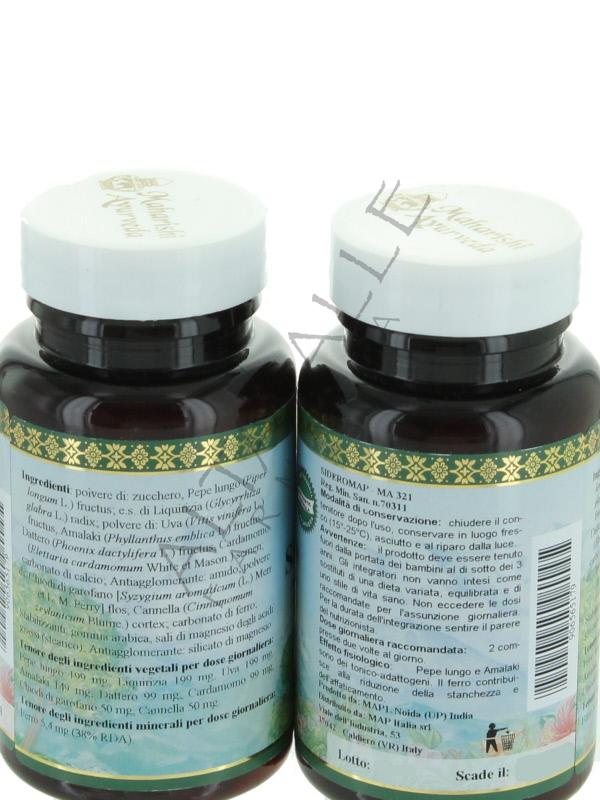 Estratto secco di liquirizia (glycyrrhiza glabra l.) radix; polvere di: zucchero; pepe lungo (piper longum l.) fructus; uva (vitis vinifera l.) fructus; amalaki (phyllanthus emblica l.) pericarpium; cardamomo (elettaria cardamomum white et mason.) semen; dattero (phoenix dactylifera l.) fructus; carbonato di calcio; ossido di ferro; polvere di: cannella (cinnamomum zeylanicum blume.) cortex; chiodi di garofano [syzygium aromaticum (l.) merr. et l. m. perry)] flos; stabilizzanti: amido; gomma arabica; stearato di magnesio; antiagglomerante: silicato di magnesio.