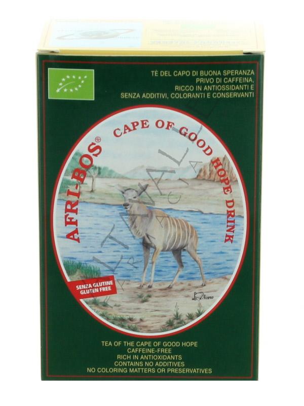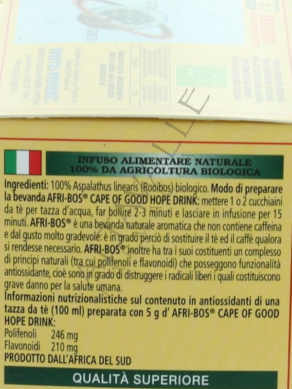 Afri Bos The Rooibos è un tè proviene dal Capo di Buona Speranza, 100% organico, il Rooibos è una leguminosa naturalmente senza caffeina e senza tannini, per cui la bevanda che si ottiene non contiene eccitanti;