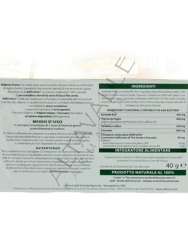 Aboca Adiprox Tisana è un valido aiuto per il controllo del peso, sia nell'ambito di regimi dietetici ipocalorici, che durante i periodi di mantenimento, grazie alla presenza di AdiProFen®, complesso molecolare 100% naturale,