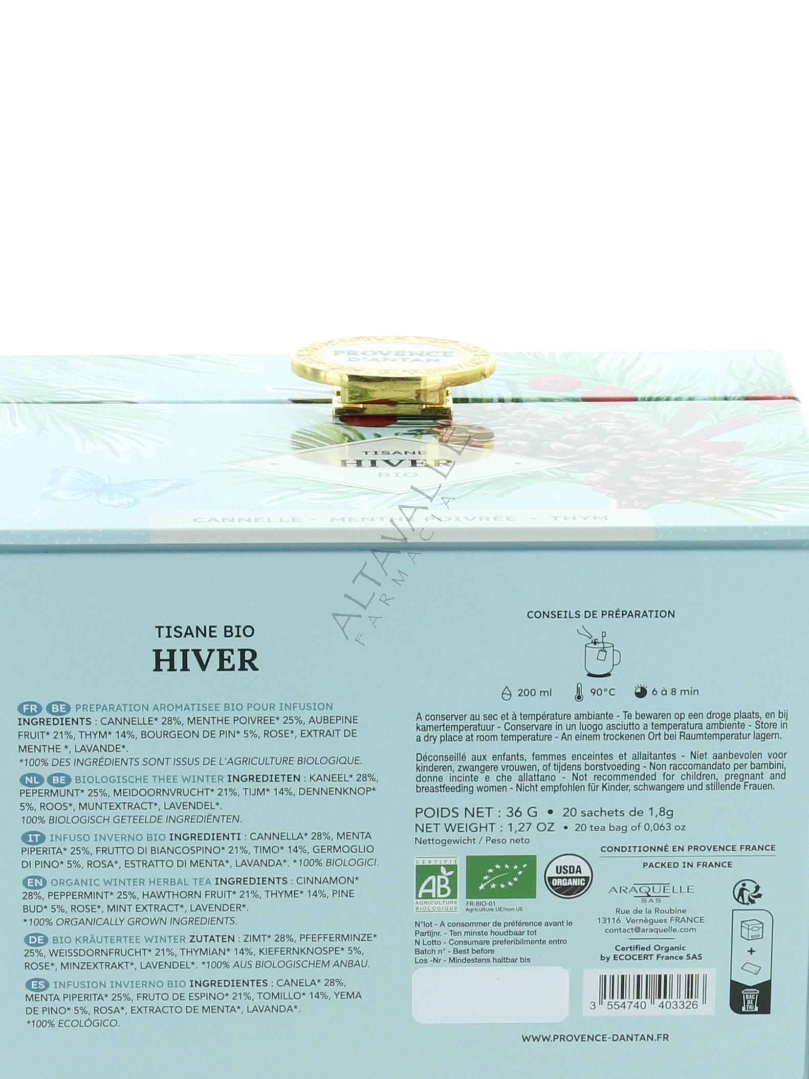 Araquelle Mon Casier Tisana Inverno biologica con cannella, menta piperita, biancospino, timo, pino, estratto di menta, rosa, lavanda, 100% biologici;