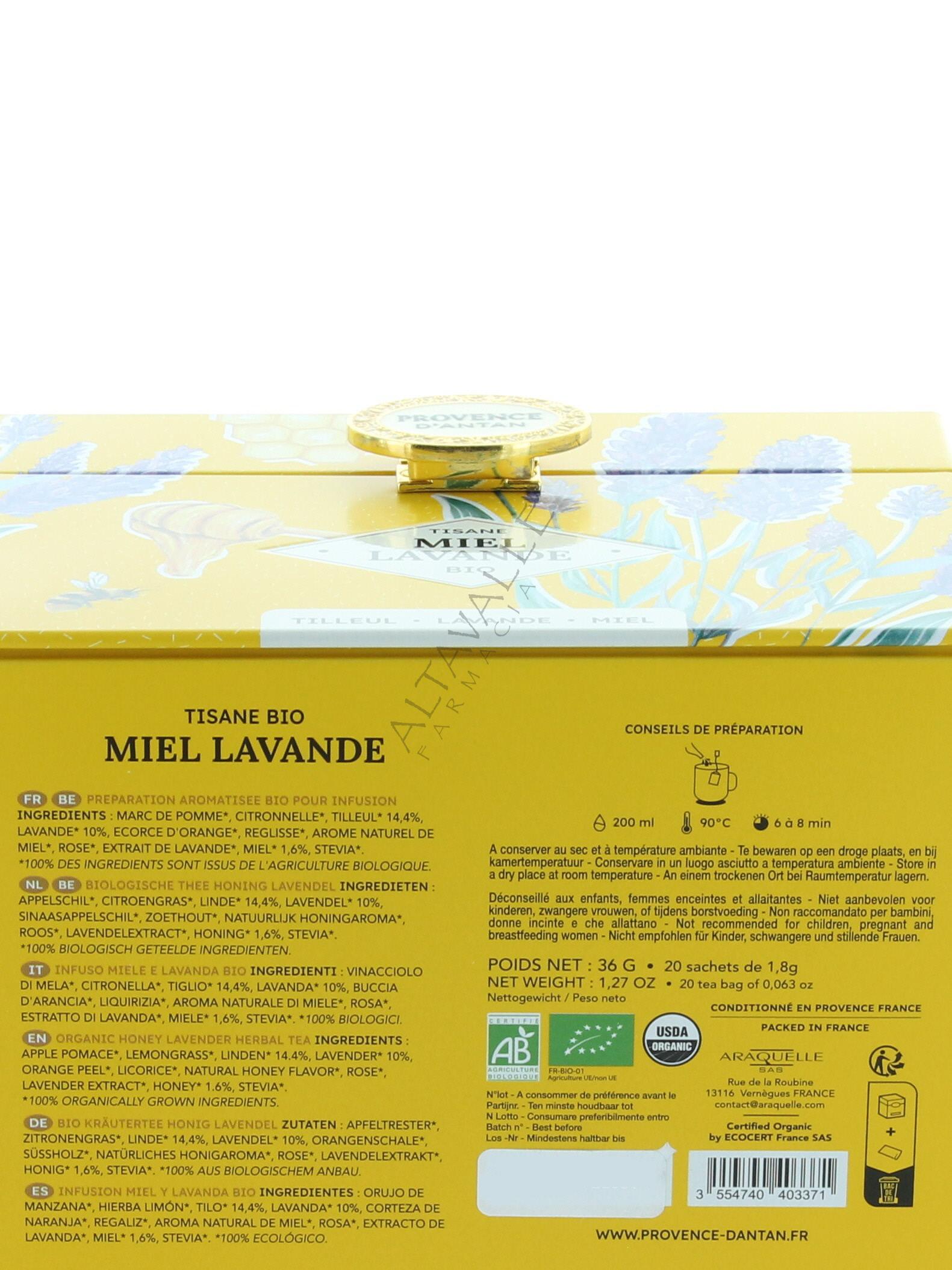 Araquelle Mon Casier Tisana Lavanda e Miele biologica con vinacciolo di mela, citronella, tiglio, lavanda, buccia d'arancia, liquirizia, aroma naturale di miele, rosa, esatrtto di lavanda, miele