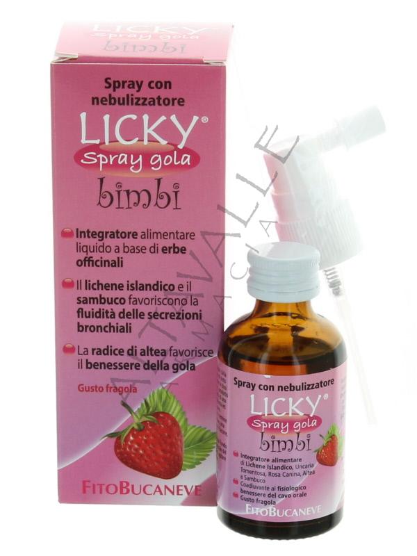 Licky Spray Bimbi gola con lichene islandico e con estratti di erbe officinali: Uncaria tomentosa, Rosa canina, Altea e Sambuco;