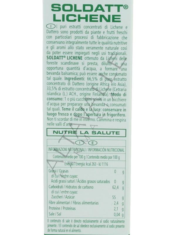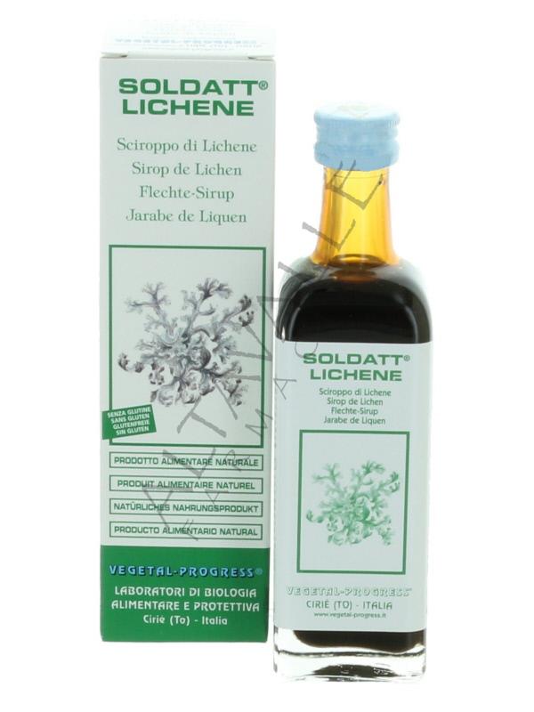 Soldatt Lichene sciroppo di Vegetal Progress composto per il 66,5% da puro estratto concentrato di Dattero e per il 33,5% da puro estratto concentrato di Lichene,