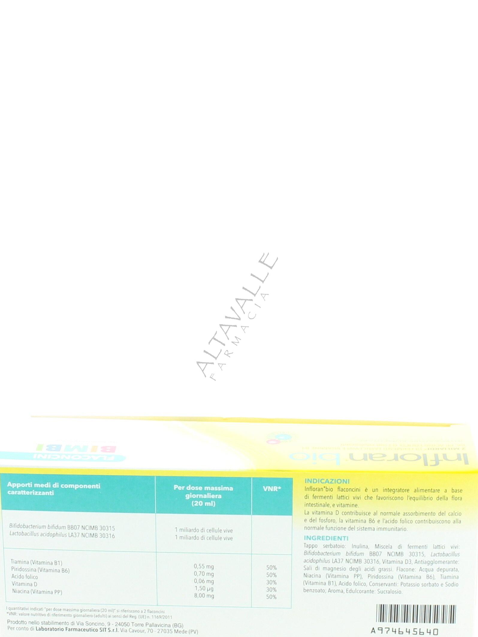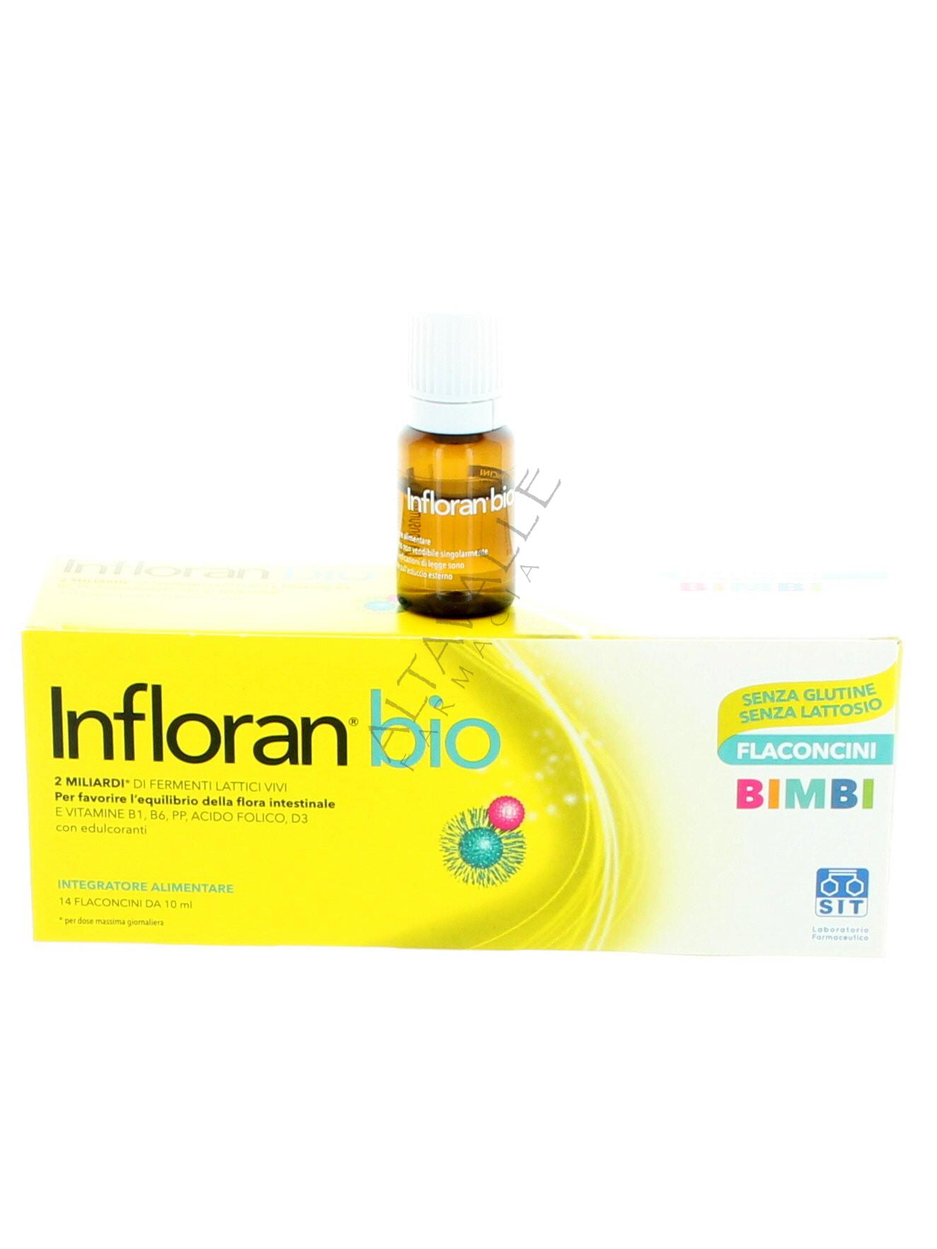 Infloran Bio Bimbi flaconcini è un integratore alimentare a base di fermenti lattici vivi (2 miliardi di una miscela di Bifidobacterium bifidum BB07 e Lactobacillus acidophilus LA37) che favoriscono l’equilibrio della flora intestinale, e vitamine,