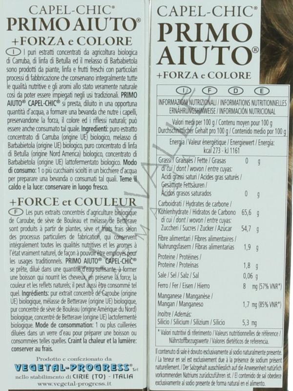 Primo Aiuto Capel Chic è puro estratto concentrato di Carruba, melasso di Barbabietola e concentrato di linfa di Betulla, 100% da agricoltura biologica;