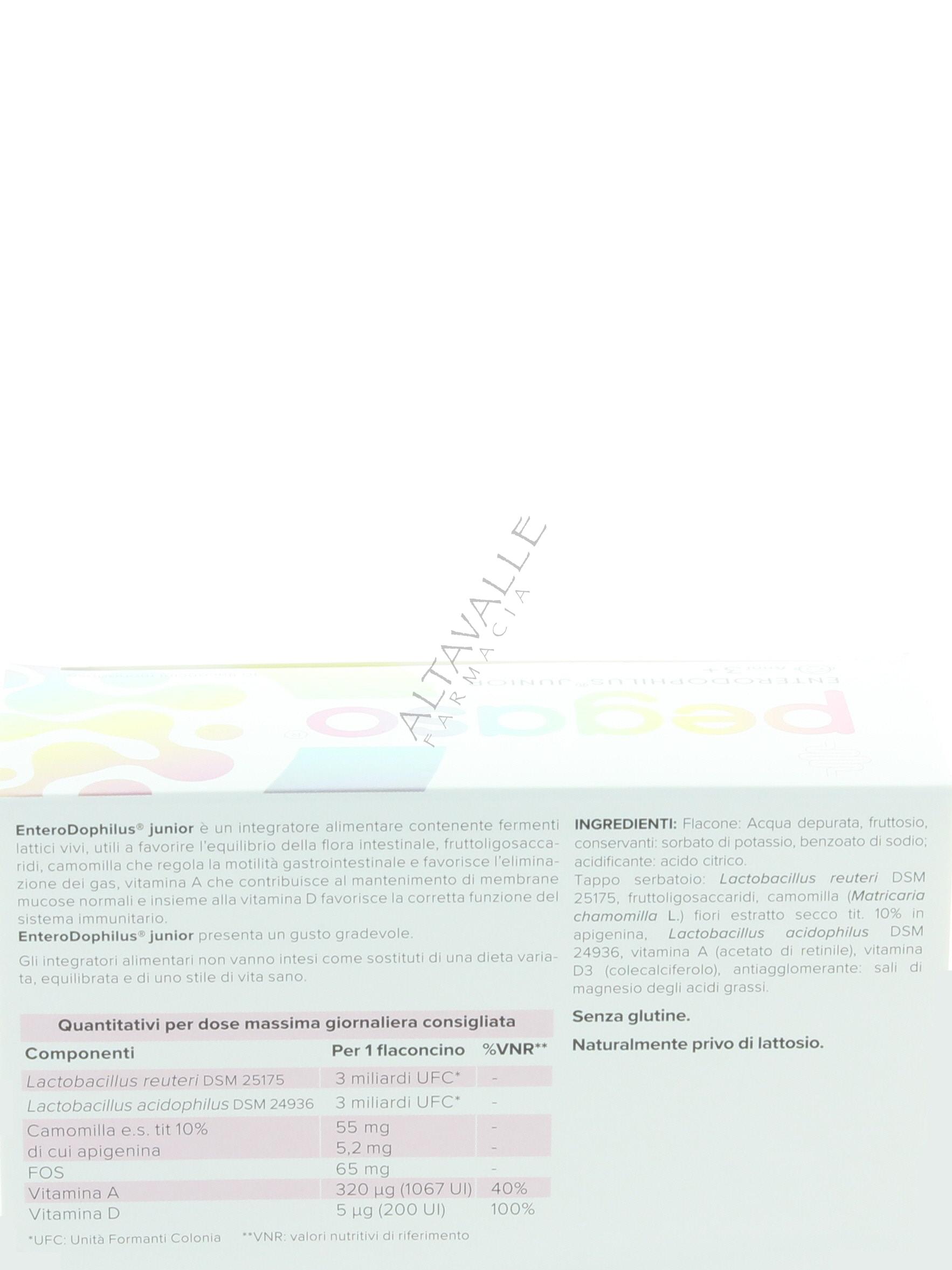 Pegaso Enterodophilus Junior è un integratore alimentare di fermenti lattici: Lactobacillus Reuteri 3miliardi, Lactobacillus Acidophilus 3miliardi, Camomilla, Vitamina A e D;