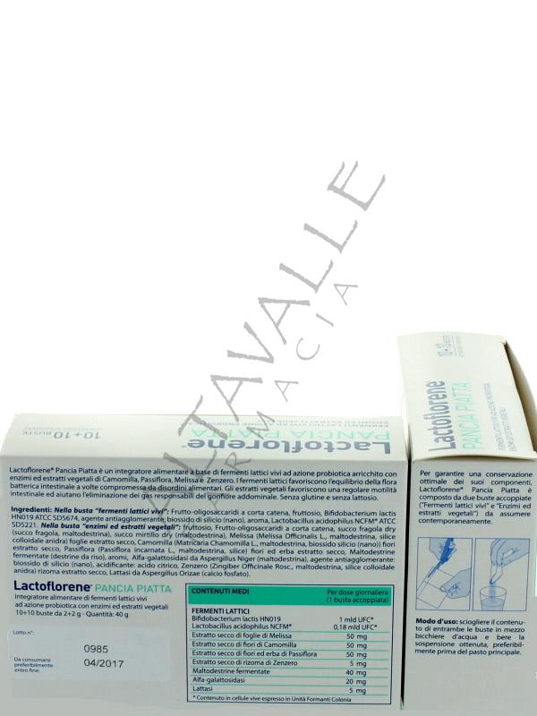 Per garantire una conservazione ottimale dei componenti contenuti, Lactoflorene ® Pancia Piatta è composto da due bustine accoppiate (“fermenti lattici vivi” e “enzimi ed estratti vegetali”) da assumere contemporaneamente. Sciogliere il contenuto di entrambe le bustine in mezzo bicchiere d’acqua e bere la sospensione ottenuta, preferibilmente prima del pasto principale.