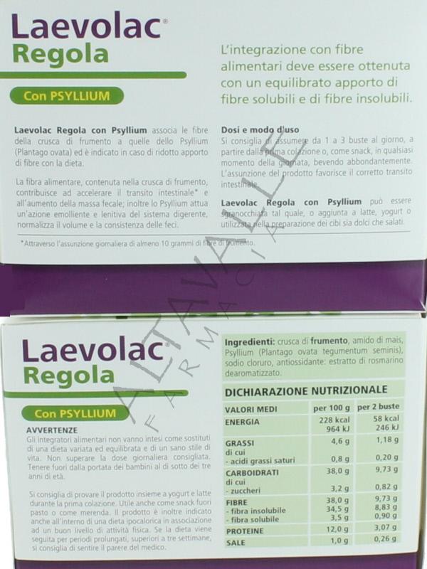 Laevolac Regola associa alla componente insolubile della Cusca di frumento la componente solubile e gelificante dello Psyllium per compensare la carenza nutrizionale di tutti i tipi di fibra utili all'organismo,
