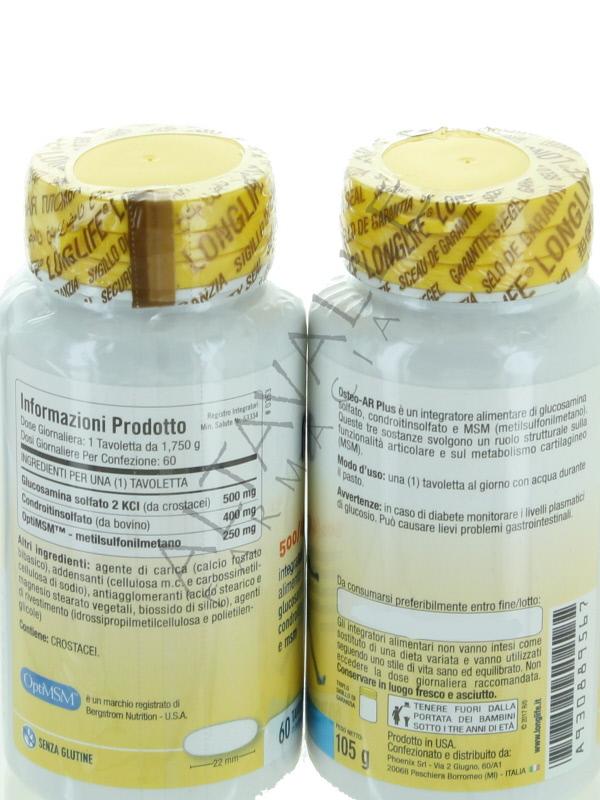 Longlife Osteo Ar Plus è un integratore di glucosamina solfato, condroitinsolfato, MSM (metilsulfonilmetano) e svolge un ruolo strutturale nella funzionalità articolare e nel metabolismo cartilagineo;
