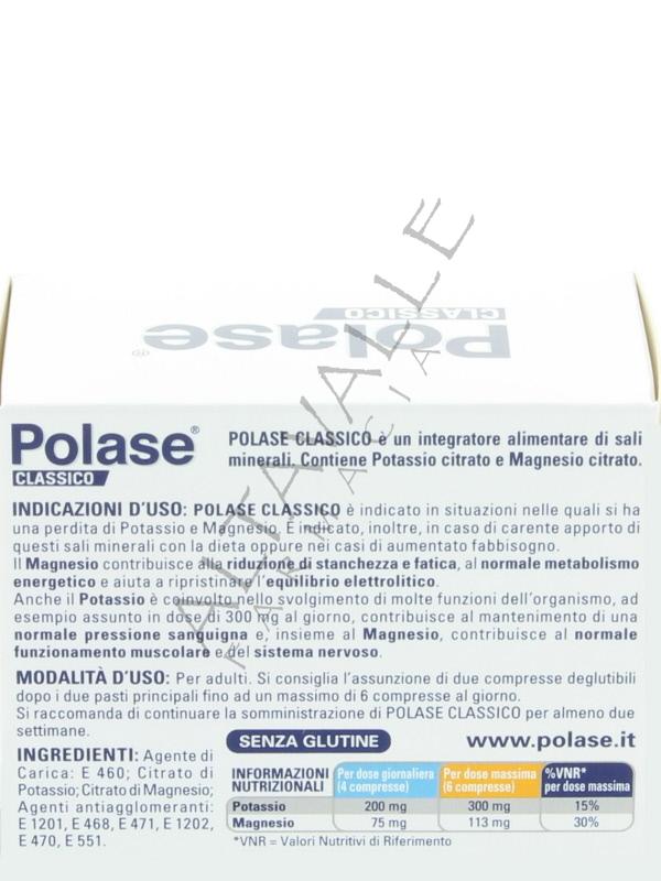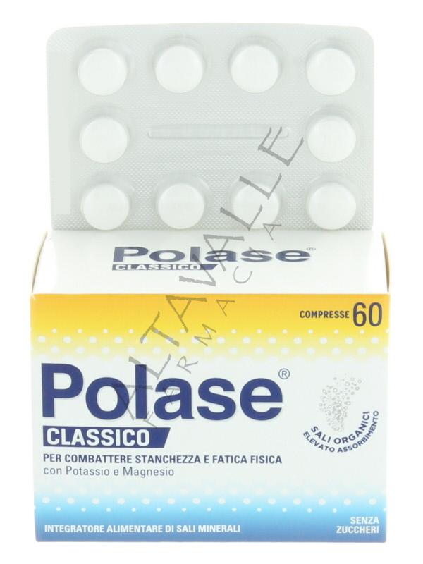 Polase Classico compresse è indicato negli stati di carenza di potassio e magnesio che possono essere provocati da eccessiva sudorazione (anche in casi di particolari condizioni climatiche), intensa attività fisica, carente apporto con la dieta oppure diete molto ricche di fibre che comportano un minore assorbimento di sali minerali;
