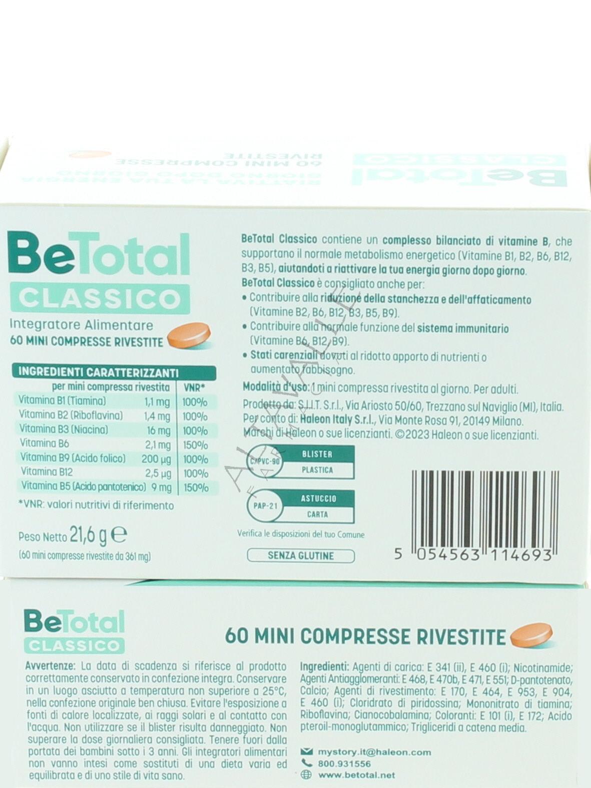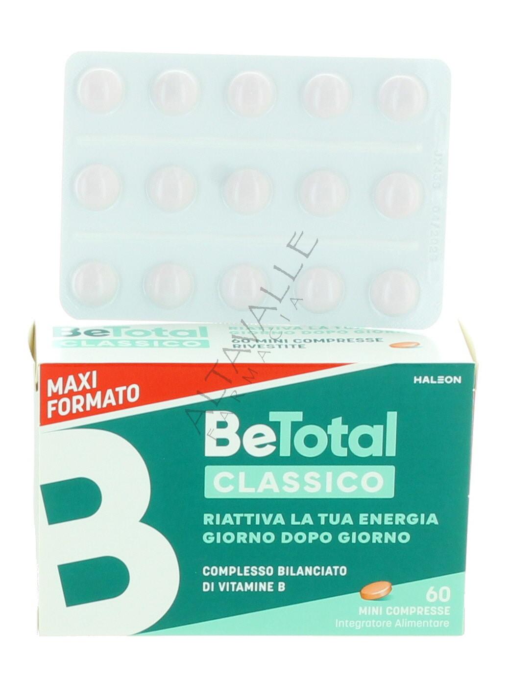 Be-total compresse è un integratore alimentare a base di Vitamine del Gruppo B, le vitamine B sono definite Vitamine Energetiche, perchè permettono di metabolizzare correttamente il cibo e di trasformarlo in “carburante” di pronto utilizzo, nonostante questa definizione non forniscono calorie, ma trasformano l'energia che viene dal cibo in energia utile per l'organismo;