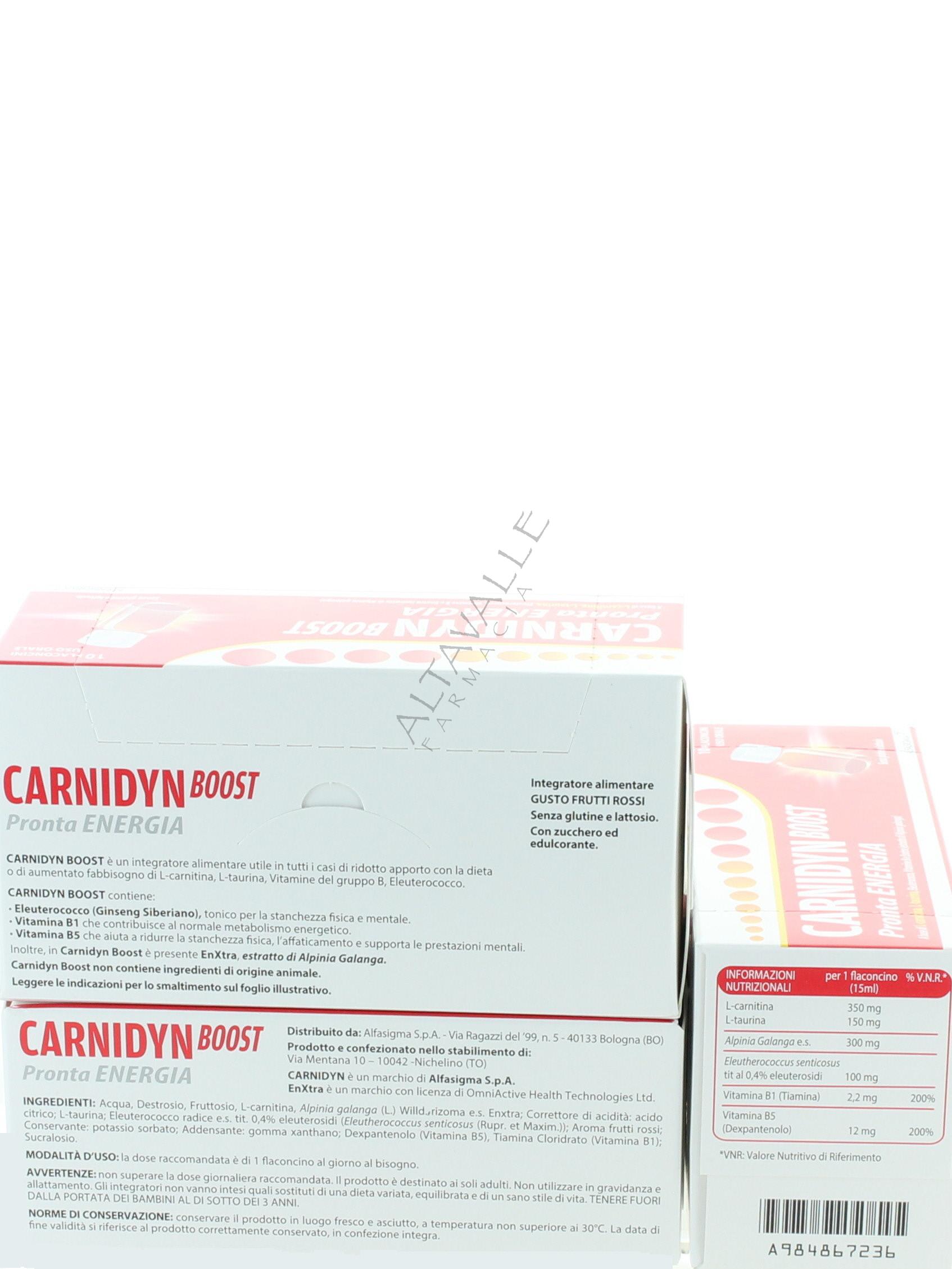 Carnidyn Boost Pronta Energia è un integratore alimentare con L-carnitina, L-taurina, Eleuterococco, Vitamine B, EnXtra (estratto di Alpinia Galanga);