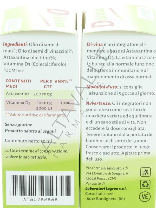 Divina Gocce è un integratore alimentare di Vitamine D3 e Astaxantina in olio di semi di Vinaccioli e Mais,