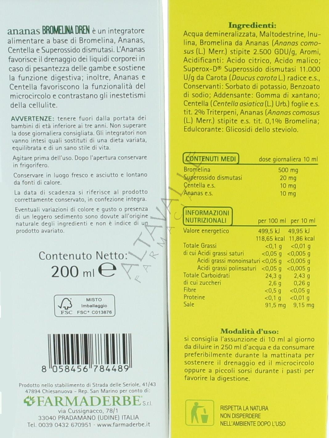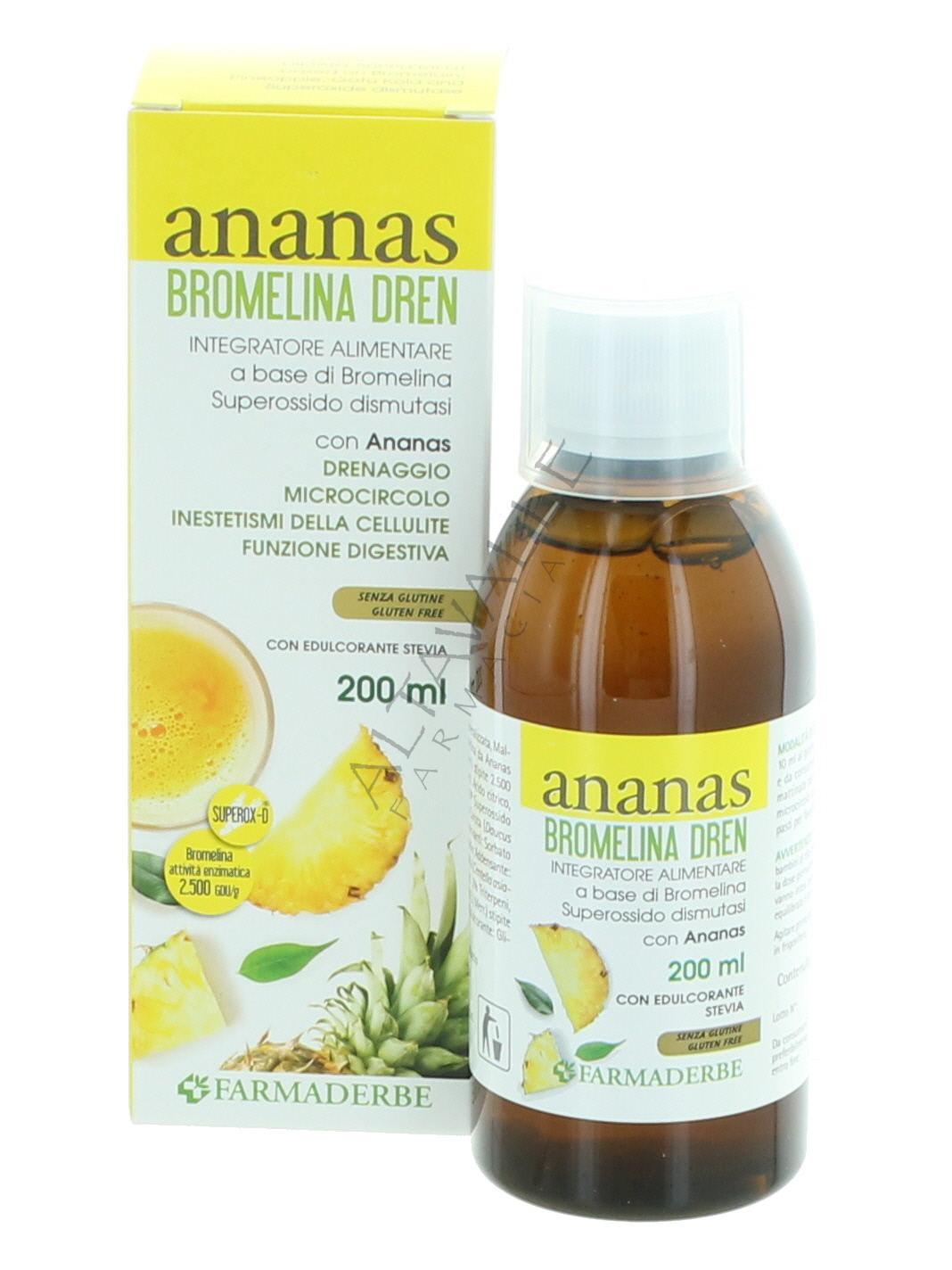 Farmaderbe Ananas Bromelina Dren è un integratore concentrato a base di Bromelina estratta da Ananas ad elevata attività enzimatica ed arricchito da SOD per contrastare i danni dello stress ossidativo;