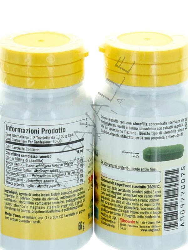 Longlife Clorofilla, pigmento naturalmente presente nelle cellule vegetali, viene scarsamente assimilata dall'organismo, perché viene disattivata e distrutta dagli enzimi digestivi e dal pH dello stomaco