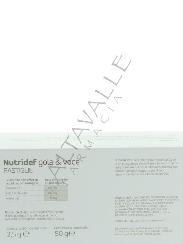 Nutridef Gola Voce Pastiglie è un integratore alimentare a base di erisimo e mirra per il benessere del cavo orale,