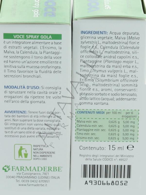 Voce spray gola è un integratore alimentare a base di estratti vegetali di erisimo, mirra, calendula, piantaggine e timo.