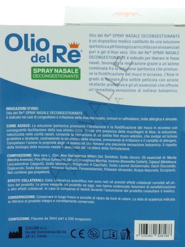 Olio Del Re Spray Nasale di Zuccari è costituito da una soluzione ipertonica a pH fisiologico arricchita con oli essenziali puri e gel d'Aloe vera;