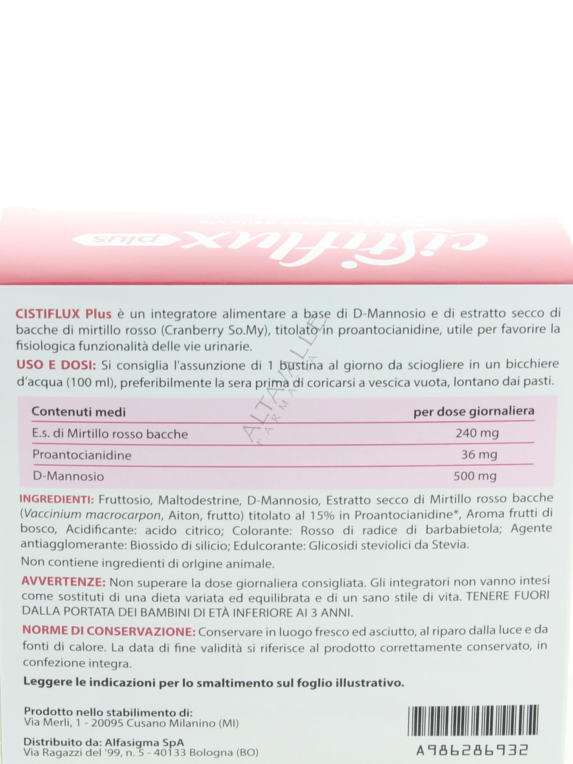 Cistiflux A Plus 36+D bustine è un integratore alimentare di Estratto di Mirtillo Rosso (Crabberry) e D-Mannosio;