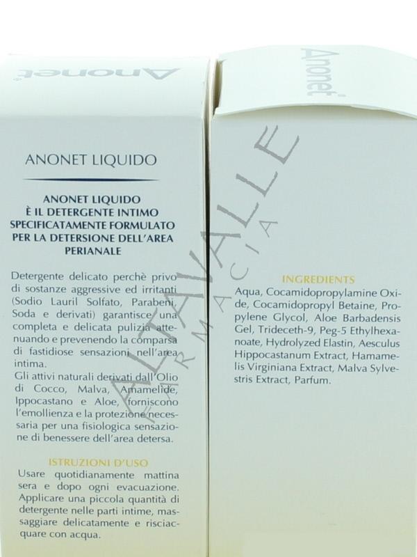 Anonet liquido adatto per l'igiene ano-genitale; attenua le sensazioni sgradevoli sulle zone intime particolarmente sensibili del neonato e dell'adulto; riduce il rischio di irritazione ed attenua le sensazioni fastidiose, di bruciori, e pruriti;