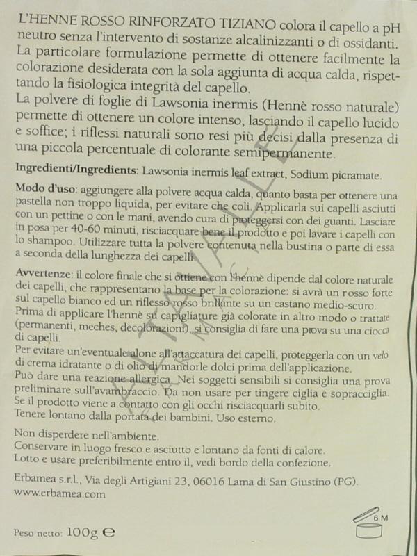 Hennè Rosso Rinforzato Tiziano è una polvere composta da foglie essicate e macinate di Lawsonia inermis (Hennè rosso naturale) che permettono di ottenere un colore intenso, lasciando il capello lucido e soffice;